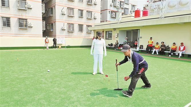 马垅社新建的门球场边还设了洗手台,方便打球的老人家。这是老年球员在比赛。(记者 庄筱婧 摄)