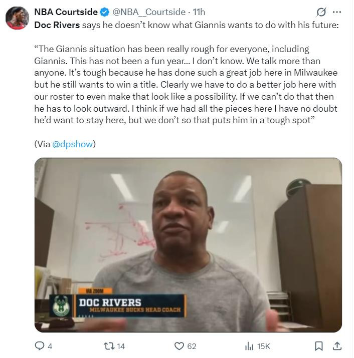 一天之前老里在直播间谈到扬尼斯的未来去向,他表示:对于这里的所有人来说处境都很艰难当然也包括扬尼斯。我和他的交流比任何人都多,他为密尔沃基做出了巨大的贡献但他依旧渴望总冠军。如果这里具备夺冠条件他肯定想留下,可这里没有这让扬尼斯陷入迷茫。(实际上也包括里弗斯本人,他也非常艰难)